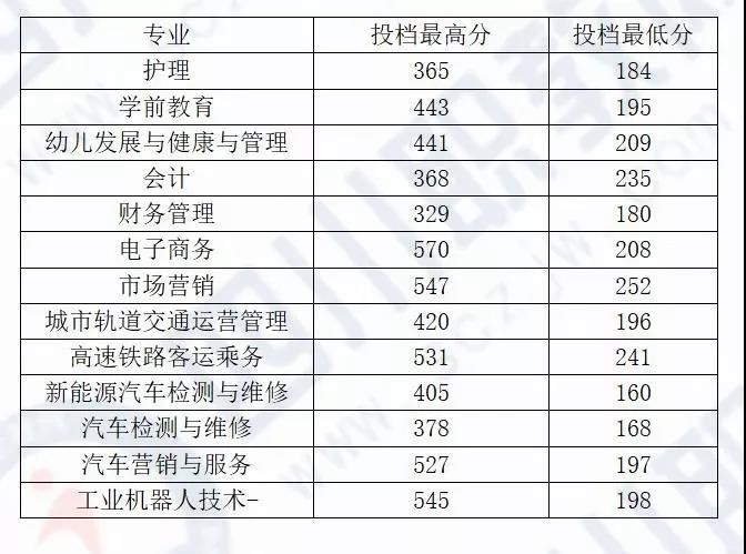 专业名称科类最高分最低分大数据与会计普高类356332建筑经济信息化管理(材料供应与管理)普高类355324现代物业管理普高类336321工程造价普高类384336工程造价(安装工程)普高类353326建设工程管理普高类356322城市轨道交通工程技术普高类357330铁道工程技术普高类353336建筑工程技术普高类370341建筑工程技术(工程质量与