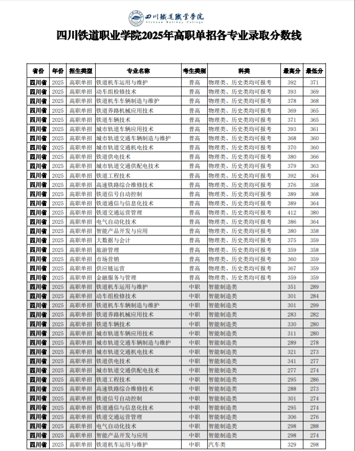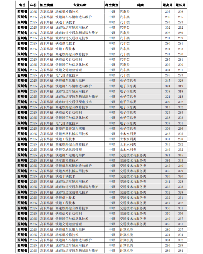 四川铁道职业学院2025年高职单招各专业录取分数线