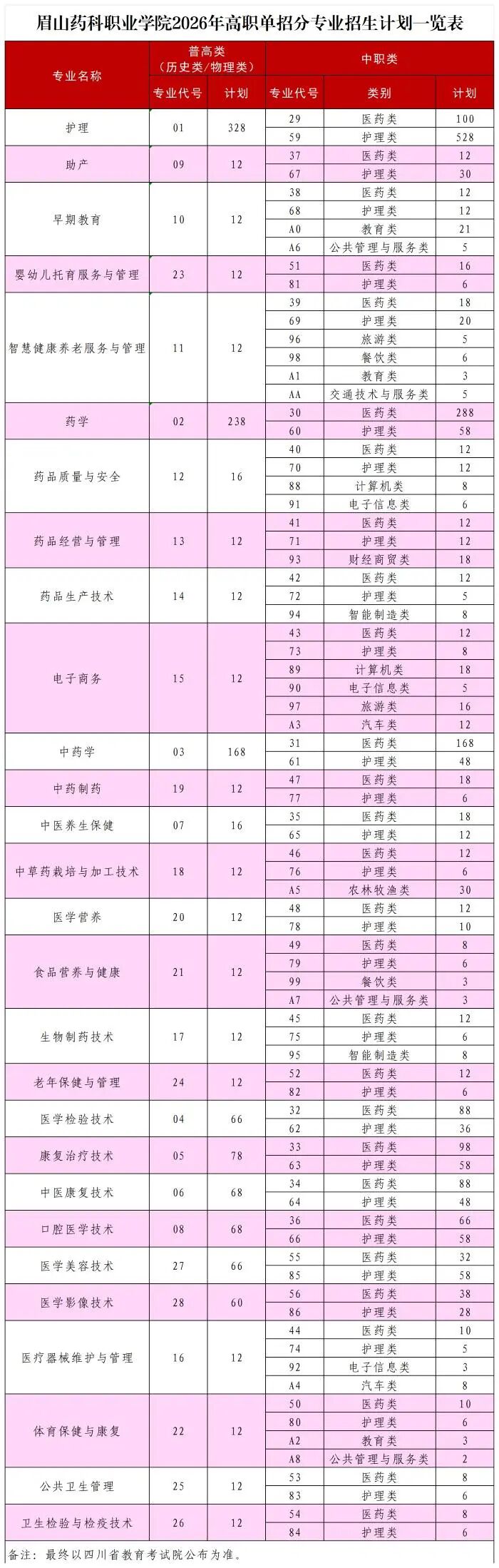 眉山药科职业学院2026年高职单招分专业招生计划一览表