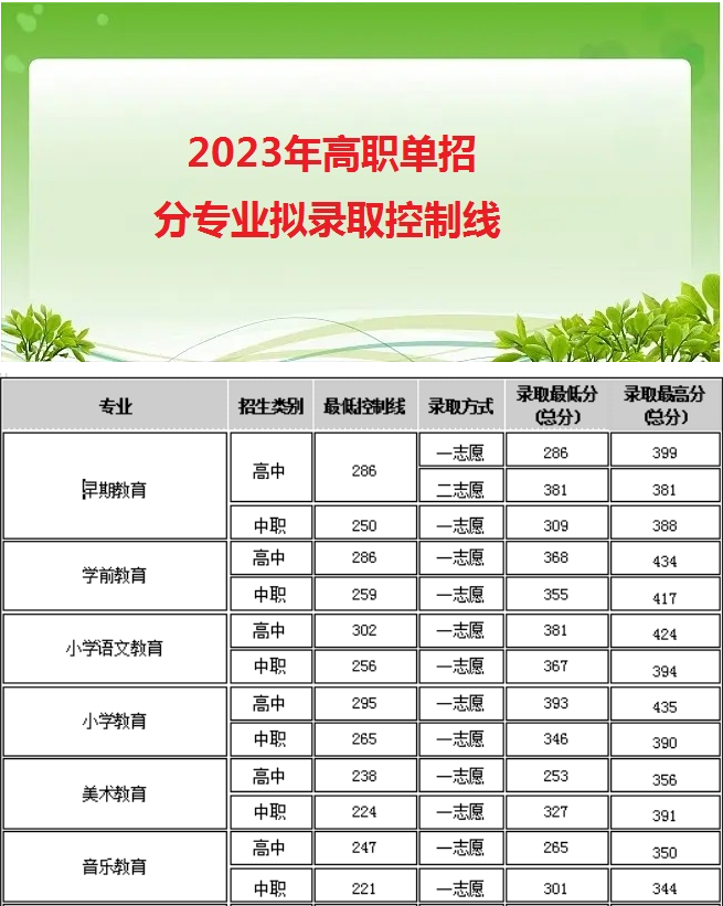 四川幼儿师范高等专科学校2023年高职单招分专业拟录取控制线
