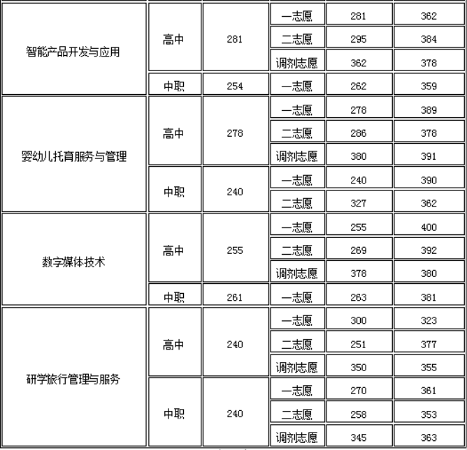 专业名称科类最高分最低分大数据与会计普高类356332建筑经济信息化管理(材料供应与管理)普高类355324现代物业管理普高类336321工程造价普高类384336工程造价(安装工程)普高类353326建设工程管理普高类356322城市轨道交通工程技术普高类357330铁道工程技术普高类353336建筑工程技术普高类370341建筑工程技术(工程质量与