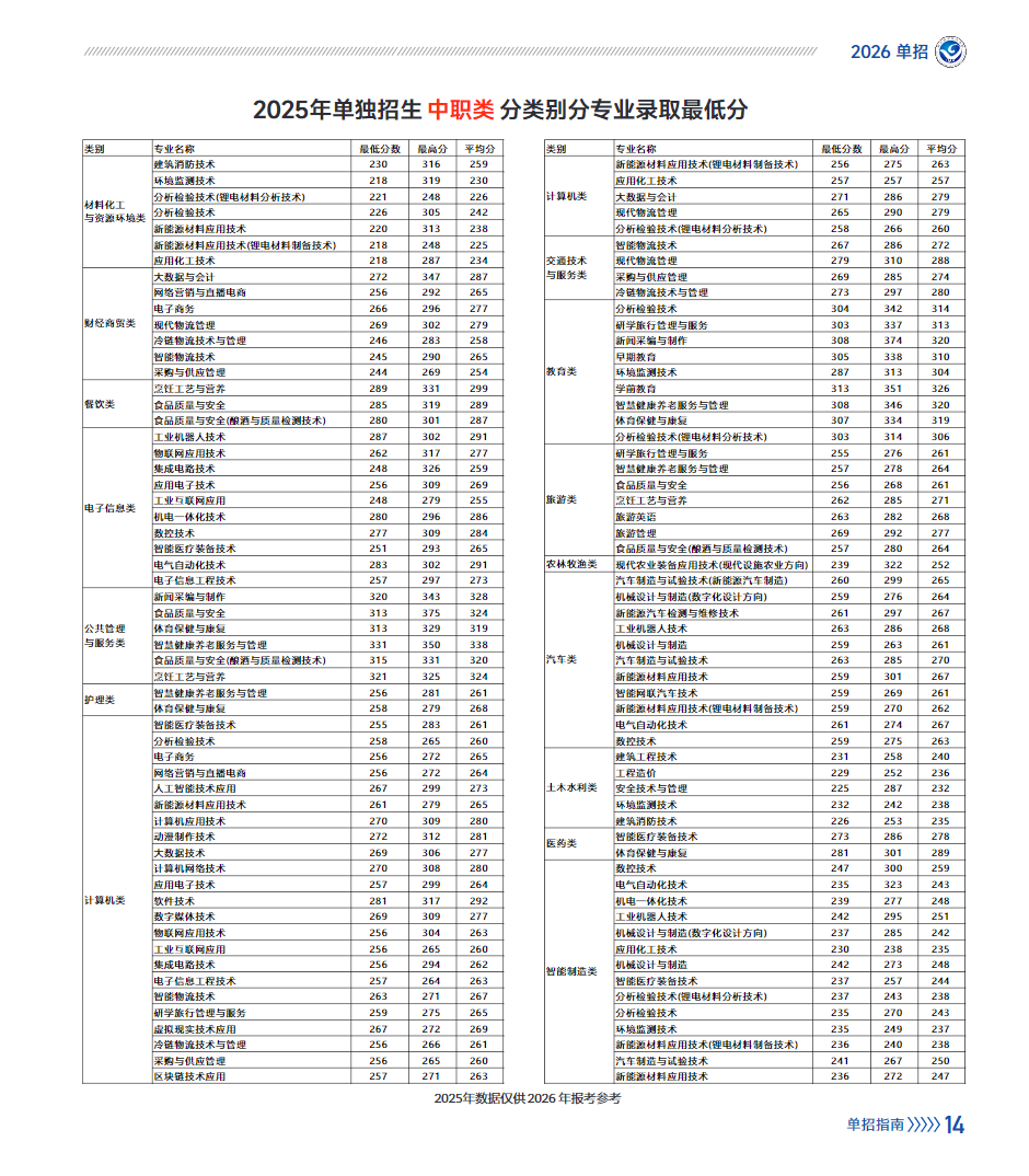 专业名称科类最高分最低分大数据与会计普高类356332建筑经济信息化管理(材料供应与管理)普高类355324现代物业管理普高类336321工程造价普高类384336工程造价(安装工程)普高类353326建设工程管理普高类356322城市轨道交通工程技术普高类357330铁道工程技术普高类353336建筑工程技术普高类370341建筑工程技术(工程质量与