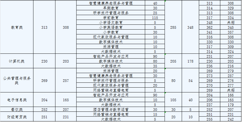 专业名称科类最高分最低分大数据与会计普高类356332建筑经济信息化管理(材料供应与管理)普高类355324现代物业管理普高类336321工程造价普高类384336工程造价(安装工程)普高类353326建设工程管理普高类356322城市轨道交通工程技术普高类357330铁道工程技术普高类353336建筑工程技术普高类370341建筑工程技术(工程质量与