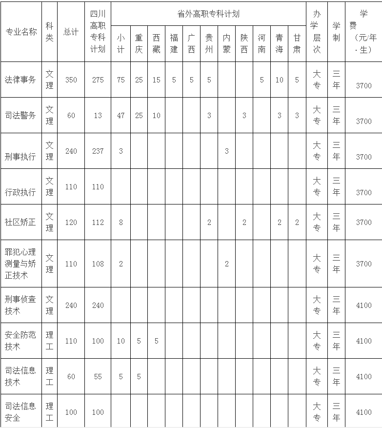 2020四川司法警官职业学院单招招生计划