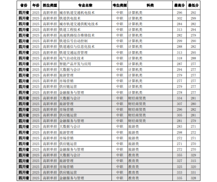 四川铁道职业学院2025年高职单招各专业录取分数线