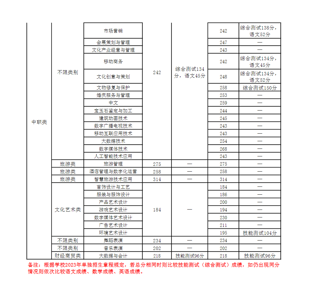 南充文化旅游职业学院2023年高职教育单独招生最低控制线上各专业人数与分数线